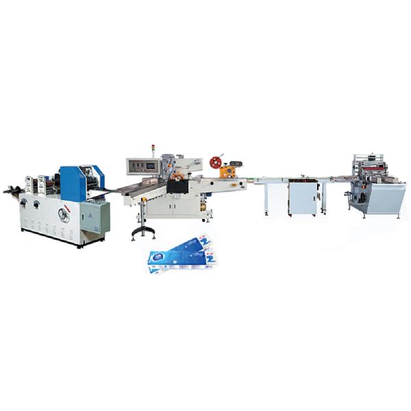Automatic handkerchief production line is consists of four parts: Handkerchief Folding Machine, Separating Unit, Single Bag Packing Machine and Multiple Bags Packing Machine. Raw material from jumbo roll first through color printing unit(optional), Then embossing and folding into handkerchief. And then separated into different sets by separating unit, then go to the single bag packing and multiple bags packing. This line realizes the whole production process is automatic. It greatly improve the efficiency and reduce labor cost and easy to operate. It adopts failures tracing and alarm system, failures will be found and settle immediately, which save the lost in a maximum way. Handkerchief folding size, tissue number of each bag and multiple packing bag number all can be made according to clients’ requirement.